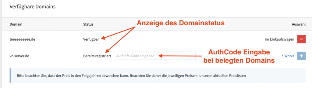 5. Es wird Ihnen nun darunter der Domainstatus angezeigt, also ob die Domain noch frei verfügbar oder bereits belegt ist. Wenn Sie eine bereits belegte Domain, von einem anderen Provider zu Ihnen, übertragen möchten dann geben Sie dort den benötigten AuthCode der Domain ein. Den AuthCode erhält der Domaininhaber immer von seinem derzeitigen Provider.